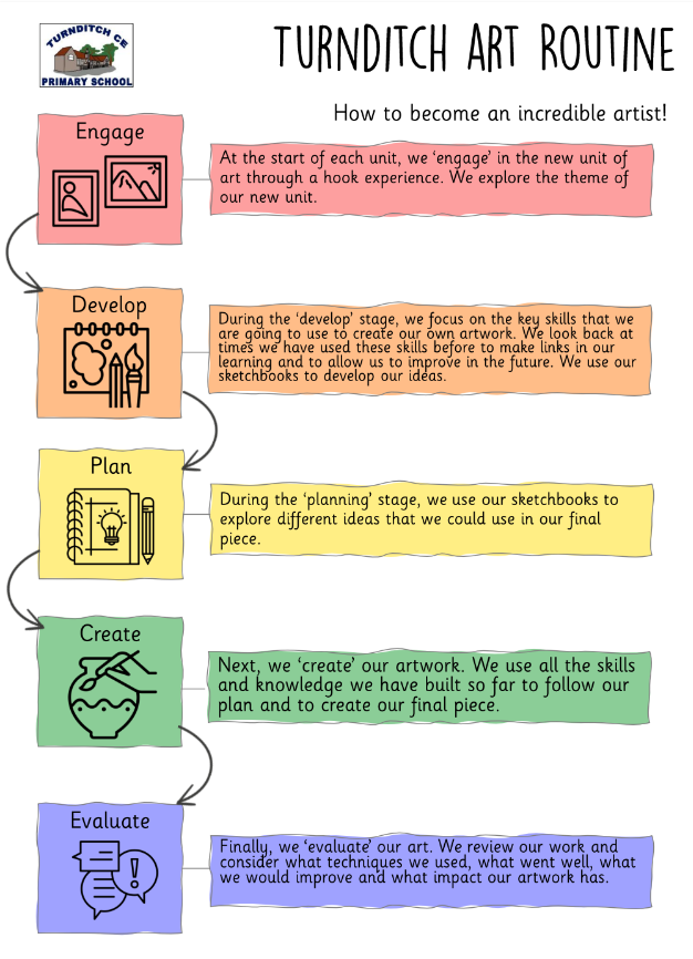 Throughout their learning in Art and Design, every child is given the opportunity to learn the skills of drawing, painting, printing, sculpture and digital art through the exploration of key artists, craft makers, designers and their work. Children use a sketchbook to make initial sketches, develop skills, record ideas and develop opinions. We give the child ownership of their sketchbook in order to foster their sense of creativity. Through in-depth discussion, the pupils explore how their art can share commonalities with famous art and use subject-specific vocabulary to discuss key artworks and their own work. In the development of confident art critics, the pupils share their opinions and make informed observations about what will improve their own practical work. Opportunities to reflect and develop, including through the use of sketchbooks, and chances for self and peer-assessment are planned into each unit of study in KS1 and KS2.